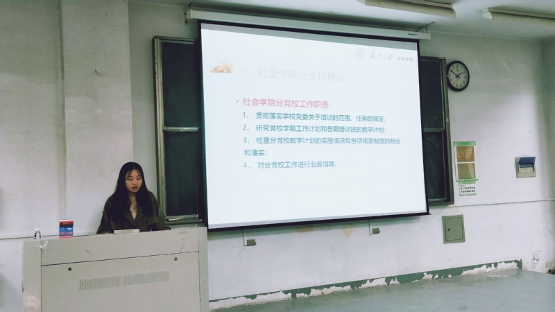 随后,分党校学生工作负责人李晓梅同学向全体学员介绍了学院分党校的工作职责、工作任务,并就3个培训班的学习内容、学习计划以及结业要求做了详细介绍。