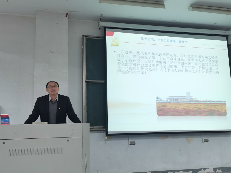开班典礼结束后,邓国林书记作了以学习贯彻习近平总书记“七一”重要讲话精神为主题的党课教育。他结合个人对习近平总书记“七一”讲话精神的认识和体会,从“伟大事变:中国共产党诞生”、“伟大成就:党百年奋斗及伟大成就”、“精神之源:首次提出伟大建党精神”、“基本方略:未来中国共产党怎么做”四个方面对习近平总书记“七一”重要讲话的重大意义、主要内容和丰富内涵进行了阐释。邓书记首先通过列举中国共产党拯救民族存亡的一系列运动来证明中国共产党的诞生的必然性,随后回顾了党带领中国人民取得的伟大成就。从经济落后到经济全面、高速发展,从贫困到全面小康,党带领人民取得了一项又一项成就,在取得的成就的背后,是我们党为中国人民谋幸福、为中华民族谋复兴的初心和使命。同学们要牢记党的初心和使命,同时必须牢记和践行32字的伟大建党精神:坚持真理、坚守理想,践行初心、担当使命,不怕牺牲、英勇斗争,对党忠诚、不负人民。邓书记重点重申了习近平总书记“七一”重要讲话中“以史为鉴、开创未来”的“九个必须”要求,并且通过实际的例子帮助同学们深刻理解这些要求。