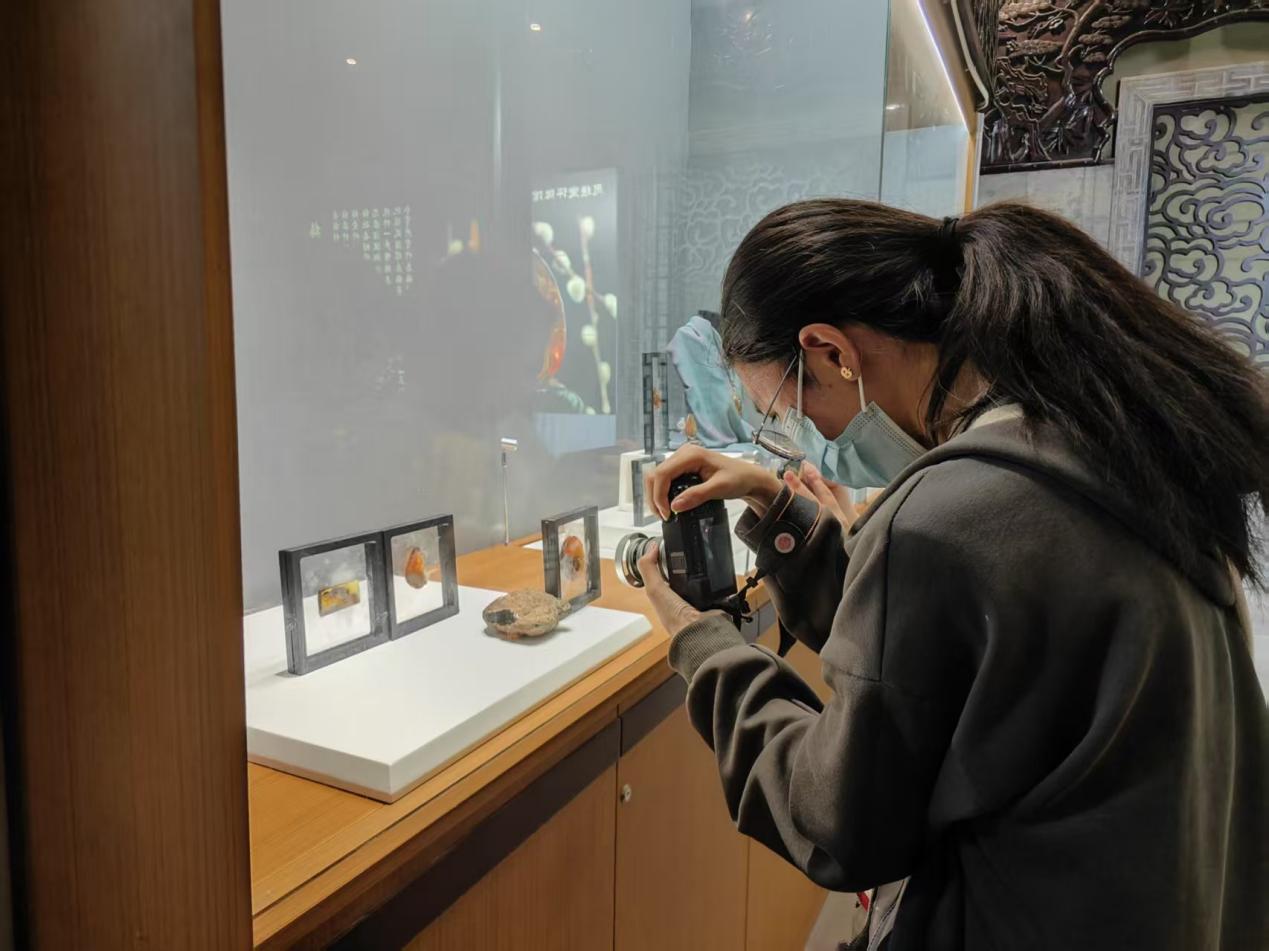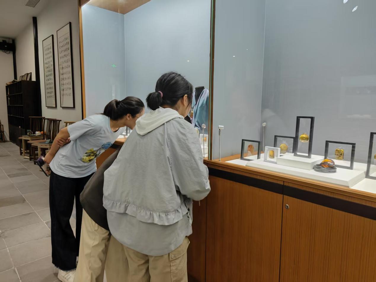 静声步入馆内的“思绩堂”大厅,充斥眼帘的便是沉淀在雕梁画栋间的千年光阴。同学们的目光首先被陈列于评弹舞台两侧的琥珀雕刻牢牢吸引:玻璃展柜内,历尽千万年孕育出的树脂化石,天然纹理如流动云雾,背景透光处晶莹温润;在非遗匠人的手下,它们幻化为了花鸟虫兽、山水人物,橙黄、蜜蜡、金珀,绚烂迷人、光彩夺目。