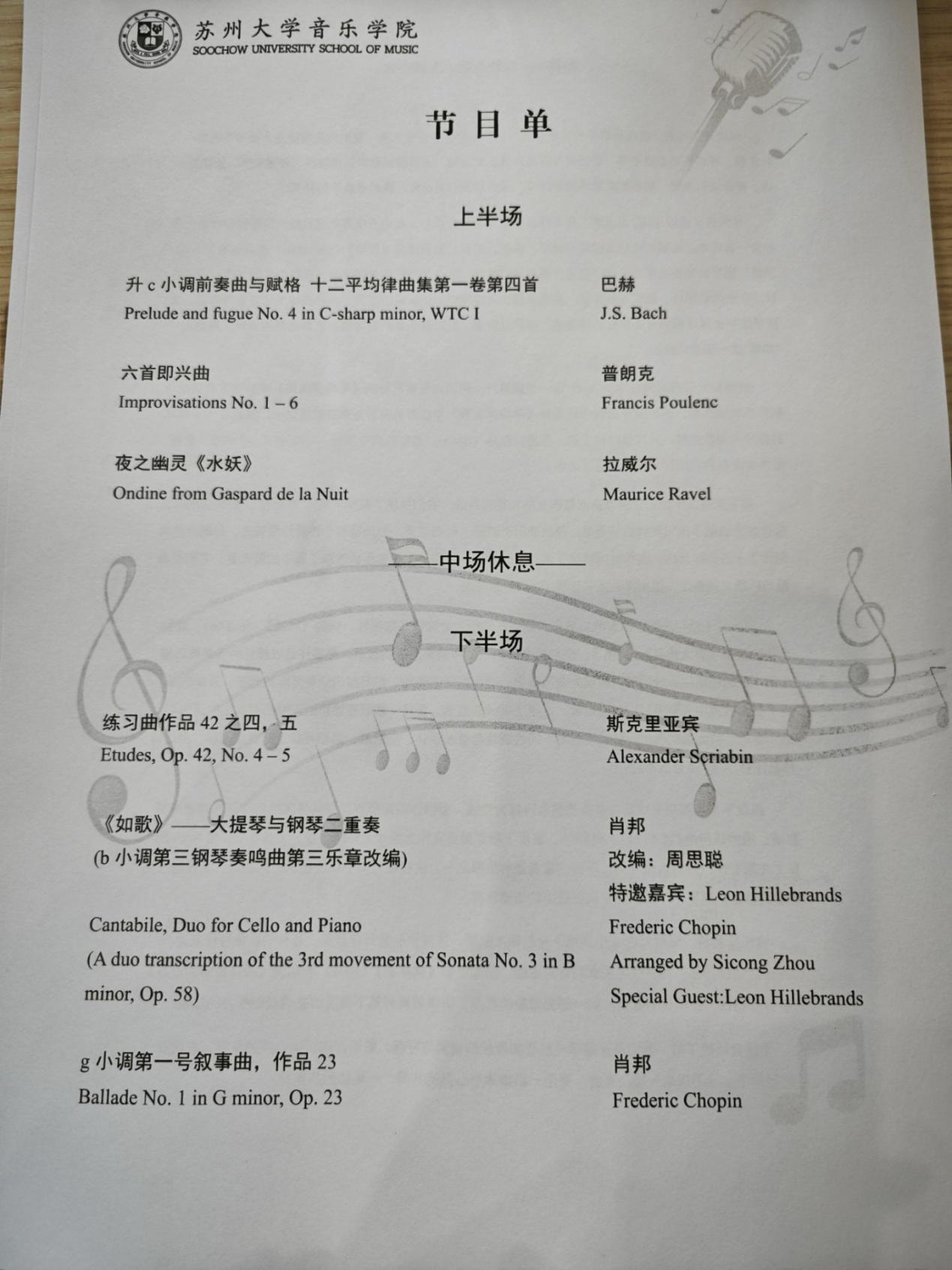 演奏会以巴洛克巴赫的古典曲目为开端,行进到浪漫主义代表普朗克、拉威尔那颇具奇色彩幻的灵动乐章,又向我们展示了近现代风格大师斯克里亚宾对现世音乐的探索性韵调。