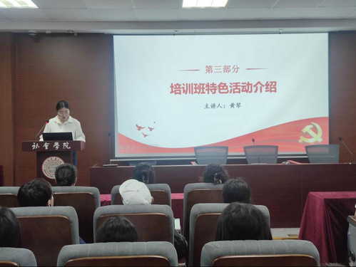 最后,2024级社会学专业黄琴同学结合以往活动经验,详细介绍了培训班的特色活动内容,分为“常规活动”、“外出实践活动”及“特色文化活动”三类,向学员们展示了丰富的活动内容和形式。她鼓励全体学员积极参与各项活动,在实践之中提升思想感悟,将理论内化于心,外化于行。