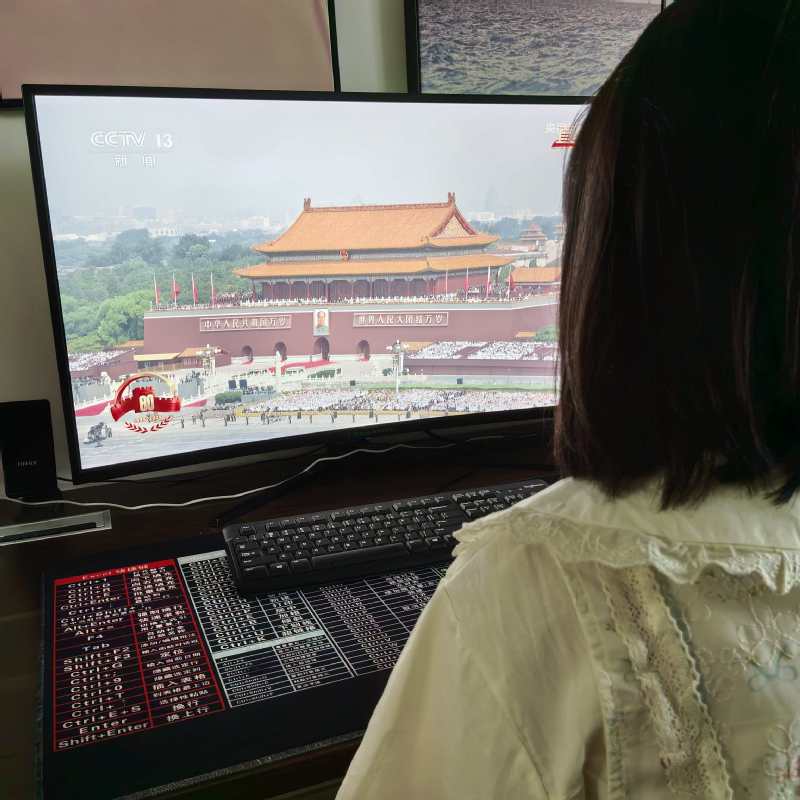 随着激昂的乐曲响起,护旗方队迈着铿锵有力的步伐护卫党旗、国旗、军旗前行,受阅部队以整齐的队列、昂扬的姿态依次通过检阅台,先进的武器装备逐一亮相,充分展现出我国强大的国防实力与维护世界和平的坚定决心。现场师生全神贯注,目光紧紧追随屏幕中的每一个画面,多次响起激动与自豪的掌声。
