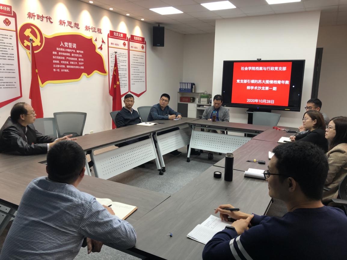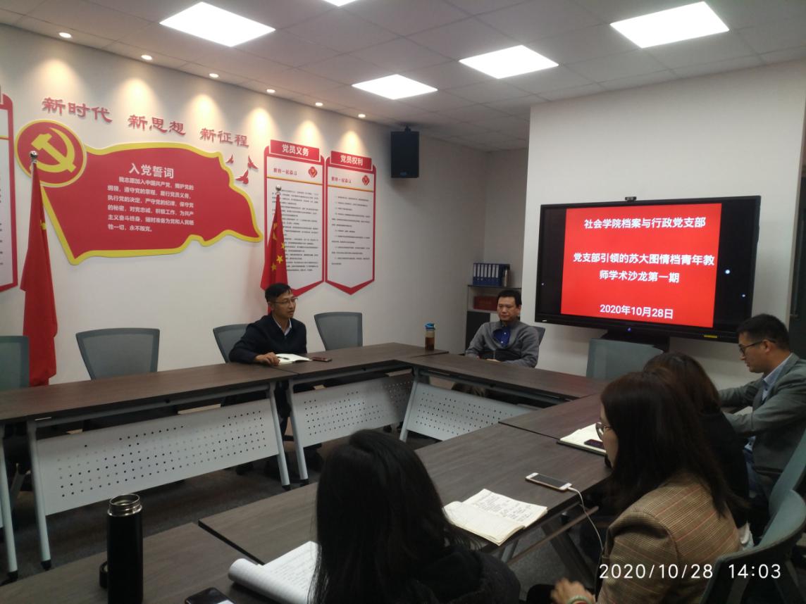 2020年10月28日下午1点30分至3点30分,档案与行政党支部10月份主题党日活动暨苏大图情档青年教师学术沙龙第一期在麻豆做爱 党建活动室开展。此次活动是档案与行政党支部对麻豆做爱 支部书记项目“支部引领的苏大图情档青年教师学术沙龙项目的建设与推进”的具体实施。