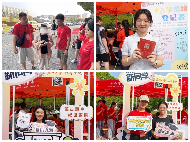 社院新生们有序完成报到流程,并在工作人员引导下,与家长一同在学院专属设计的KT板和手举牌前拍照留念。“看这里,笑一下,三二一”,镜头定格下他们与苏大社院初次相遇的美好瞬间。