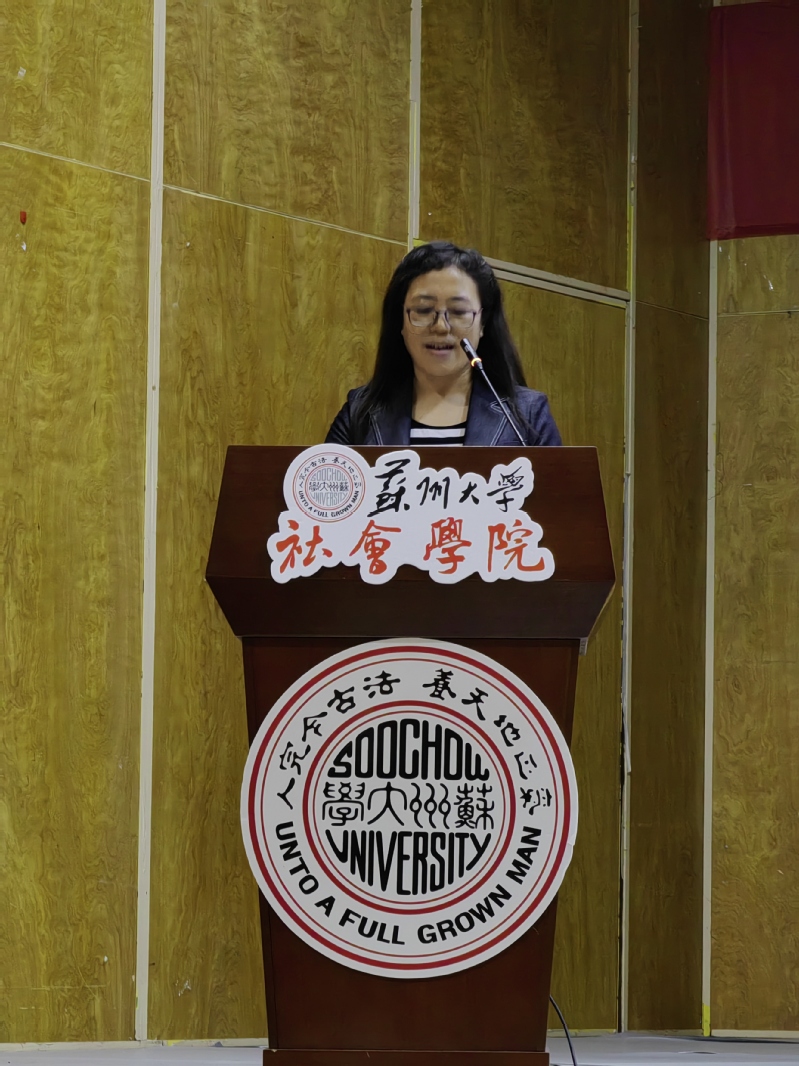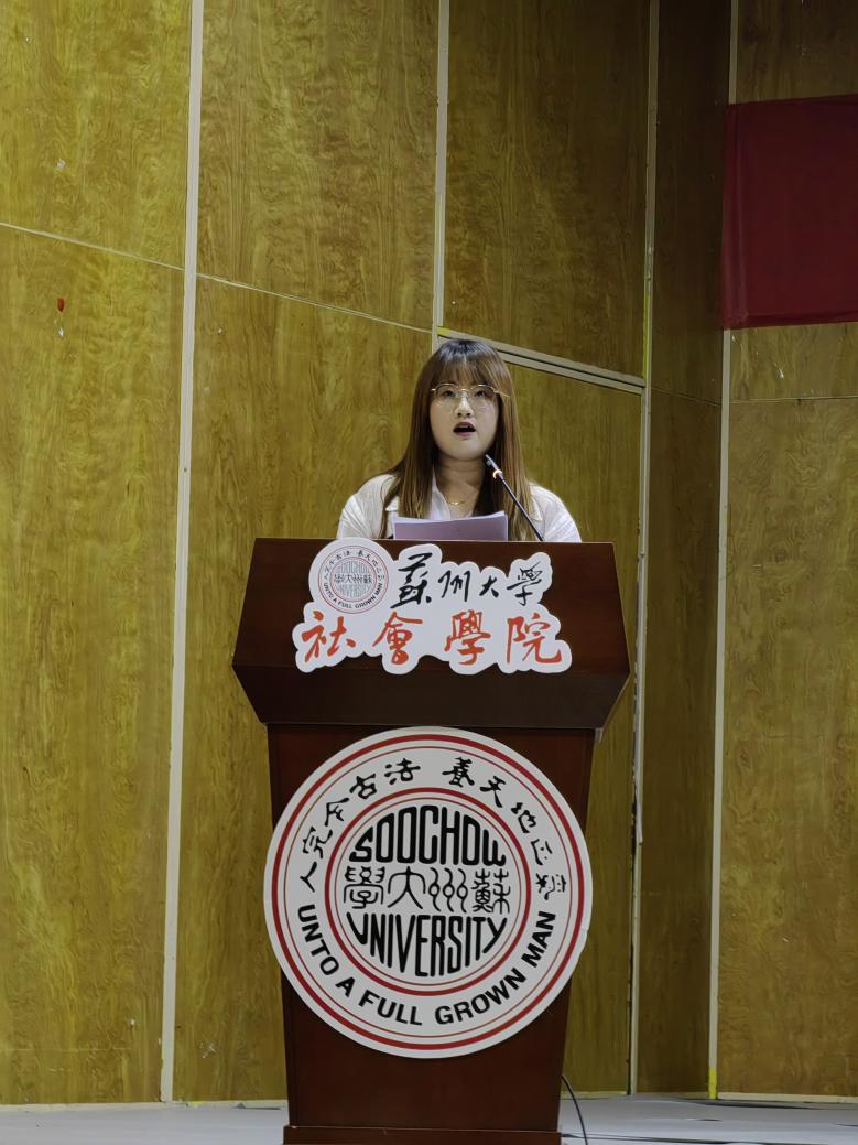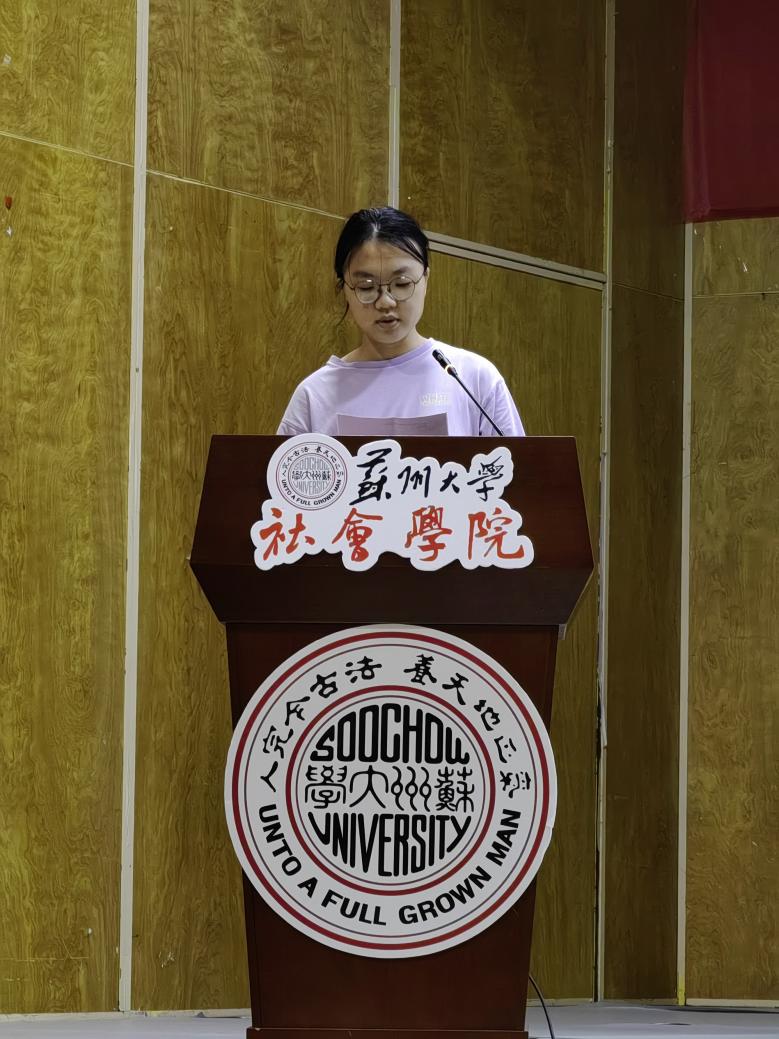 2021级图书情报与档案管理研究生王月瑶作为老生代表分享了自己在苏大社院的生活学习经历与收获。不管是与老师们相处所得,还是任职党支部,辅导员助理的工作经验,她都倾囊相授,更是在深刻理解习近平新时代中国特色社会主义思想的基础上向新生提出如下建议:在思想上要坚定信念,树立远大理想;在学业上要踏实勤勉,挖掘潜力,提高阈值;在生活上要丰富校园生活,减少焦虑内耗,做情绪的掌控者,去发现生活中美好事物的力量。