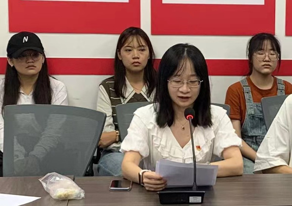 接着,学生党员代表发言。老生党员代表2022级档案学专业邬静娴同学以“牢记初心使命,践行责任担当”为主题分享自身的心得体会。她强调,强国建设、民族复兴是我们这一代应该肩负起的使命,各位党员新同学应当积极主动作为,用科学的理念、长远的眼光、务实的作风规划好学习与工作,在自己的本职工作中践行初心使命。新生党员代表2023级社会工作专业朱涵聪同学围绕“青春心向党,奋进新征程”的主题分享自身感悟。他认为,“青春向党”要牢记嘱托,要砥砺奋斗,要淬炼担当,学生党员要以青春之名,担时代之责。