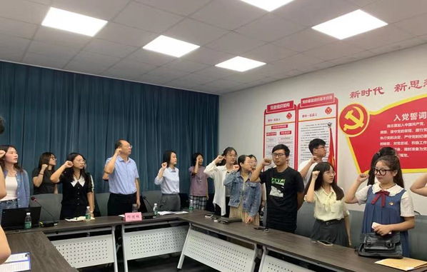 活动最后,全体新生党员在陈可欣同学的带领下,重温入党誓词,对党组织作出庄严承诺。期望新生党员们能够牢记党旗下许过的铮铮誓言,继续积极发挥模范带头作用,敢为人先、勤学苦练,做为党为人民服务的先行者!