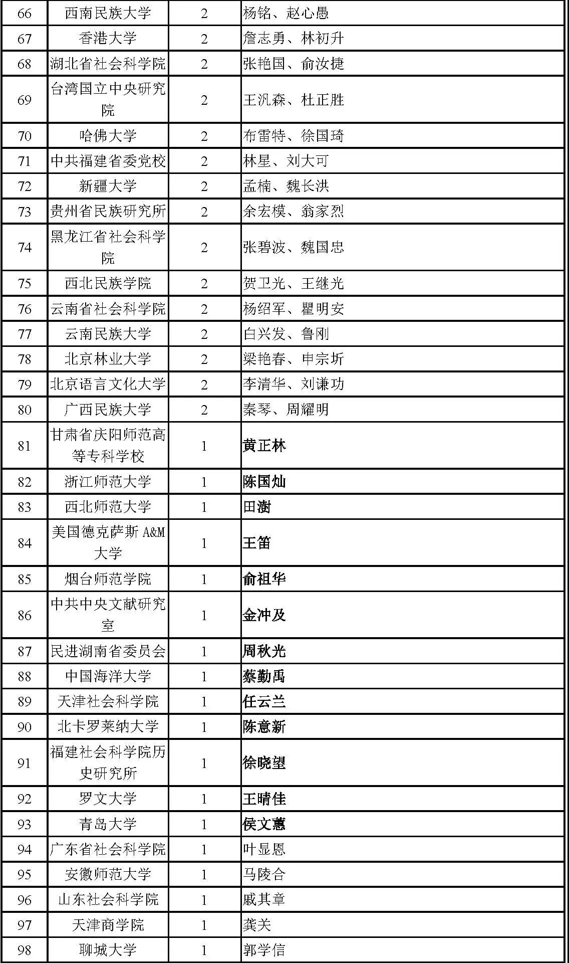 2.黑体加粗的学者姓名表示该学者为一级学科的上榜学者;一级学科是从该学科所有二级学科上榜学者中按一定比例遴选得出。凡是上榜的学者,无论排名顺序如何,均是在各学科领域论文影响力较大的学者;