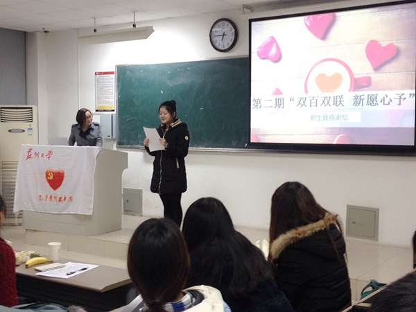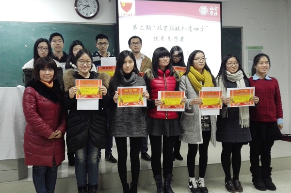 党委副书记董娜、分党校秘书马竞飞、团委老师顾林枝莅临现场,在美妙的单簧管演奏《天空之城》中与同学们共同见证见这温暖人心的时刻。 从党员新生互助对接到今日的“微心愿”终期成果展示,第二期“双百双联,新愿心予”活动开展顺利,主持人曹艺聪带领大家回顾这百日活动历程,展示百日点滴收获。党员代表蓝天雨的体会与新生代表季鸿玮的感谢让大家互听心声,感受到党员对新生浓浓的关怀以及新生对每一个志愿者无私奉献的感激;学姐学长与新生互动的视频寄予真情,呈现出党员与新生相处的每个细节;新生诗朗诵《联心》诉说真切情谊,字里行间透露出这百日里他们收获的温暖与感动。而接下来的幽默相声《红色之旅》更是活跃现场气氛,给大家带来了欢声笑语。 之后,分党校学生骨干徐晗钰与大家一同回顾本期分党校培训情况,开班仪式、党务知识测试、读书会、集中授课,内容丰富形式多样的教育培训,让预备党员、入党积极分子在学习中收获成长。沈佳楠、韩智代表第三期读书会学员分享读书心得让大家领悟到阅读促发展这亘古不变的真理,体现了本期读书会“浸润诗书之泉,荡涤浮躁之心”的主题思想。 董书记肯定了学生党员们在“微心愿”活动中的无私付出和分党校培训学员的认真与努力,衷心祝贺同学们在教育培训、志愿服务中所取得的丰硕成果,也被党员新生间的互相关怀,携手共进而感动。她希望每年一期的“双百双联新愿心予”活动能够在传承与创新中更好地实现党群互助,也希望每位学生党员能够始终以党员的高标准要求自己,做到三严三实,努力提高服务群众的能力,成为良好学风党风的引领者与维护者。 在欣赏完韵雅的歌曲《一千年以后》和小提琴独奏《琴师》之后,董书记、马老师、顾老师为优秀志愿者和优秀学员颁发证书。活动在大家热烈的掌声中圆满落幕,在这情谊浓厚的冬至之夜,一起总结,共同展望,期待更加精彩的2016! |