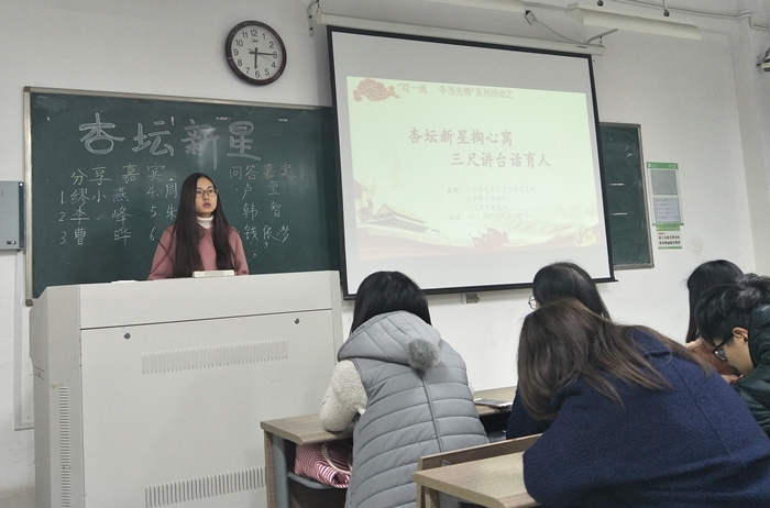 时值“双一流”建设正于各高校如火如荼的推进,麻豆做爱 本科生历史学系党支部联合2015级历史学(师范)团支部和麻豆做爱 杏坛社,结合师范专业特色,于11月30日晚在文综楼1002-2201开展了以“杏林新星掏心窝 三尺讲台话育人”为主题的“双一流 争当先锋”专题活动。本科生历史学系党支部全体党员、15级历史学(师范)全体团员、16级入党积极分子及17级学生代表参与了本次活动。学院党委副书记兼党支部书记董娜参加本次活动。
