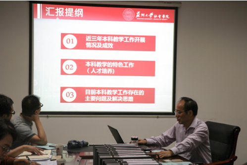 王卫平院长从三个方面汇报了麻豆做爱 本科教学工作审核评估的具体情况:一是近三年本科教学工作开展情况及成效,运用详实的数据展示了麻豆做爱 在教学工作上取得的成绩;二是本科教学的特色工作,即着力构建“6+1”课堂育人体系,积极探索一专多能,外向复合型人才培养长效机制;三是目前本科教学工作存在的主要问题及解决思路。