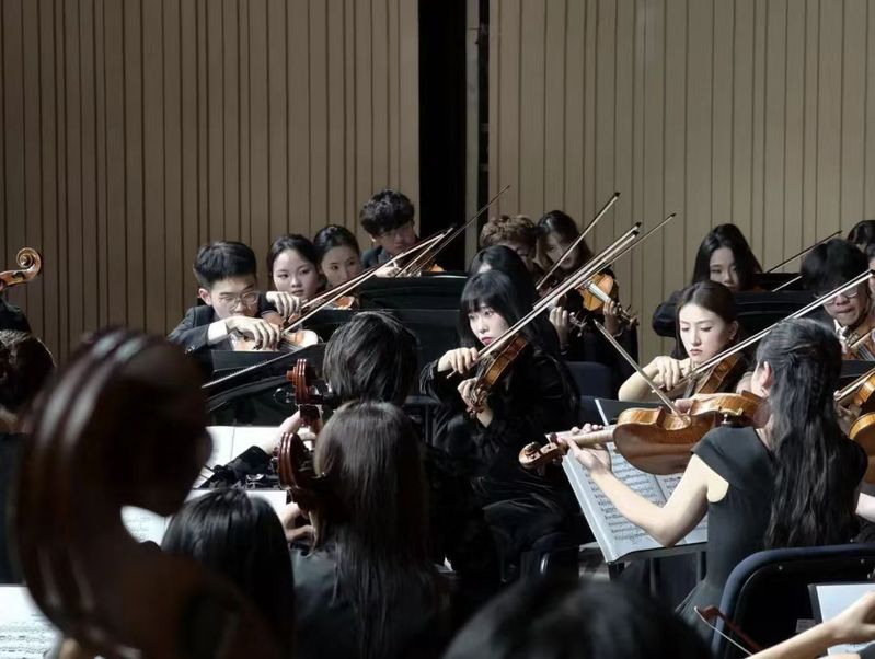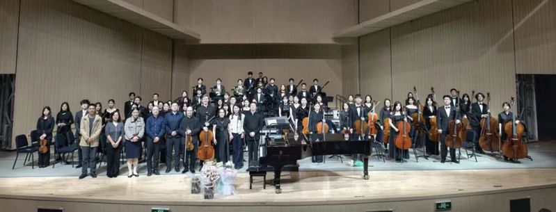 随后奏响的《F大调第八交响曲,作品93》风格灵动活泼,乐团以娴熟技艺演绎出各乐章的独特韵味,让现场气氛愈发轻松愉悦。压轴登场的《C大调三重协奏曲,作品56》由我校三位外籍教师联袂献艺,小提琴清亮悠扬、大提琴醇厚深沉、钢琴灵动婉转,三者配合默契无间,将乐曲的和谐层次与丰富内涵展现得淋漓尽致,演出结束后,全场响起经久不息的热烈掌声。