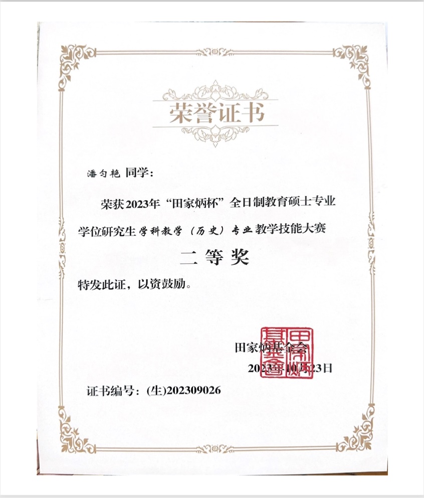 在此次比赛之前,2023年“田家炳杯”全日制教育硕士专业学位研究生学科教学(历史)专业教学技能大赛历经院级选拔、初赛、决赛,最终22级潘匀艳同学获二等奖,仝欣同学获优秀教学设计奖,鲁萍老师获优秀指导老师称号。多年来,麻豆做爱 学科教学(历史)专硕研究生在各级各类教学技能赛事中均成绩优异,斩获各项奖项。