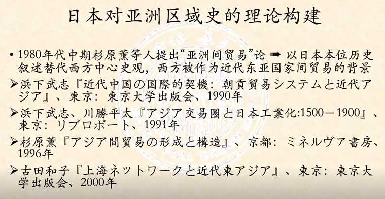 进入正题后,张老师详细阐明日本学术界“亚洲间贸易”理论的产生背景,并认为该理论欲以日本为本位重塑历史叙事,以此替代西方中心史观。而目前中国所处的历史时期与1980年代的日本具有某些相似之处,比如都处在国力与民族自信心迅速提升之时。因此应当留意日本提出的有关理论对今日中国的启示,我们大可从自身立场出发对有关理论进行吸收与完善。