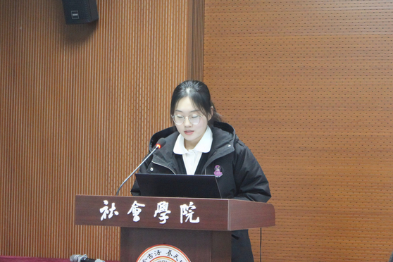 活动伊始,分党校学生工作组织理事长陈可欣同学就分党校本学期工作进行总结。她从“规范完善培训工作”、“开展系列特色活动”、“健全分党校工作机制”三个方面介绍了分党校本学期的工作成果。同时,她表达了对以后分党校工作的美好期许,并真诚地向与会领导、老师、同学们表示感谢。
