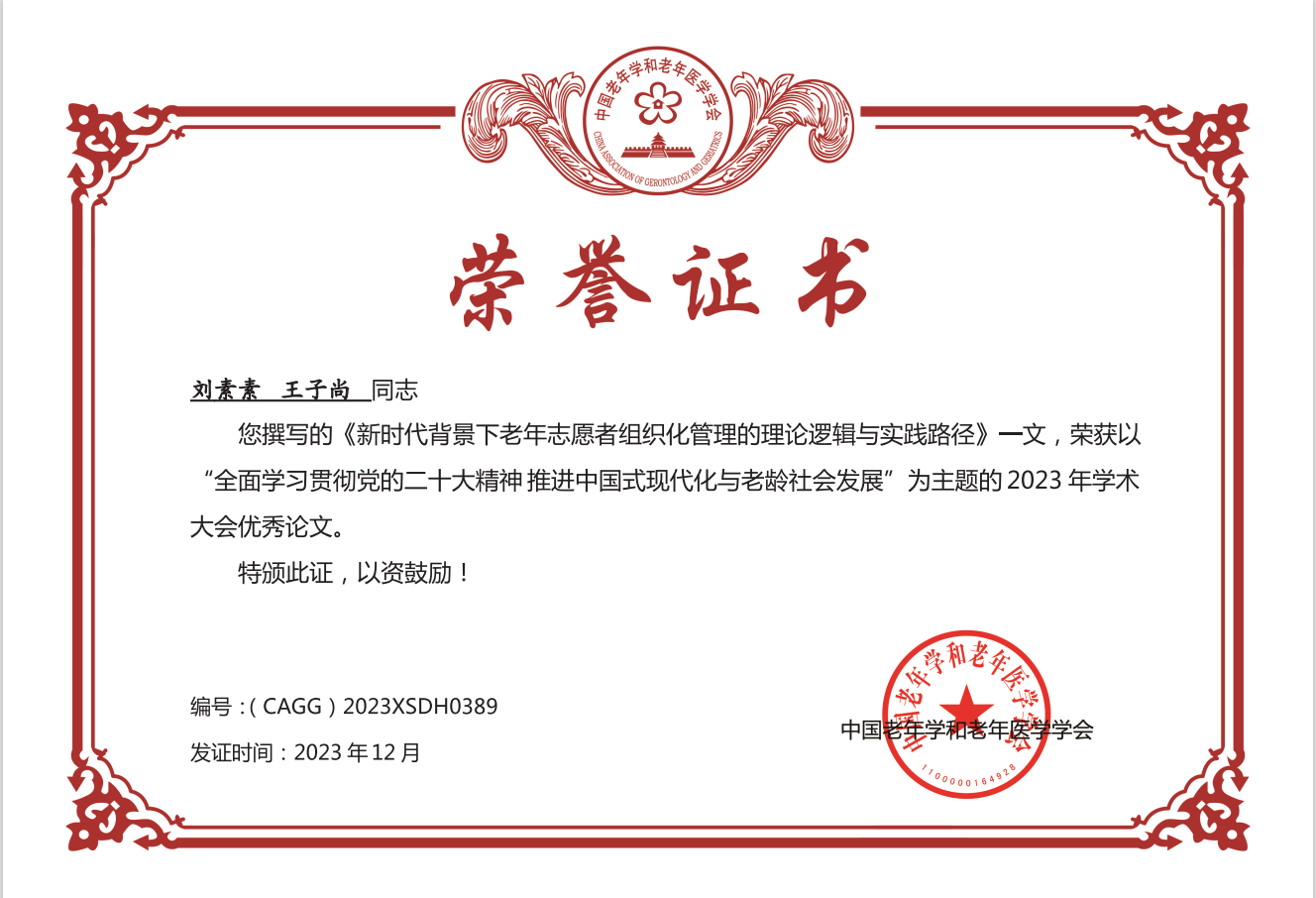 本次会议以“全面学习贯彻党的二十大精神 推动中国式现代化与老龄社会发展”为主题,广泛征集学术论文以及老龄社会发展建言,并组织专家对来稿进行筛选,最终评出相关奖项。我校社会学与社会工作系刘素素副教授及社会工作专业硕士王子尚所著《新时代背景下老年志愿者组织化管理的理论逻辑与实践路径》在本次会议中荣获优秀论文奖。其中,王子尚为本次获奖论文的通讯作者。
