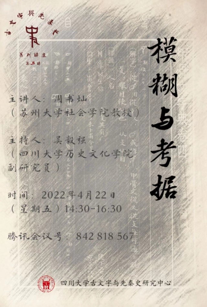 2022年4月22日,应四川大学古文字与先秦史研究中心邀请,以《模糊与考据》为题,为中心师生做一场线上报告。报告由吴毅强副研究员主持。