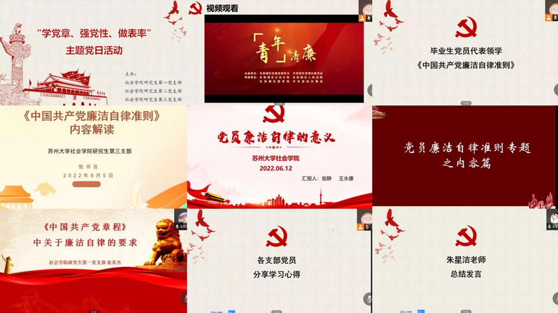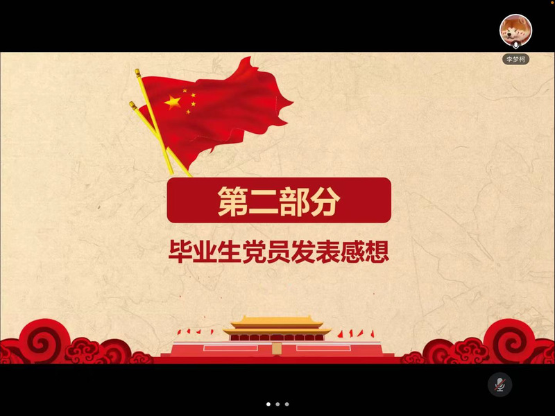 研究生第一、第二、第三党支部则在研究生辅导员朱星洁老师的带领下,线上举办了联合主题党日活动。在“观看视频‘青年·清廉’”“毕业生党员代表领学《中国共产党廉洁自律准则》”“各支部毕业生党员分享学习心得”三个环节后,朱星洁老师做总结发言。她给所有毕业生党员送上祝福的同时也对毕业生党员提出了三点期望:一是要在工作岗位上勤勤恳恳,发挥党员先锋模范作用;二是要保持清醒头脑与学生时代的热诚,不随波逐流也不要冷漠;三是要牢记中国共产党的精神追求,持之以恒地加强党性修养。