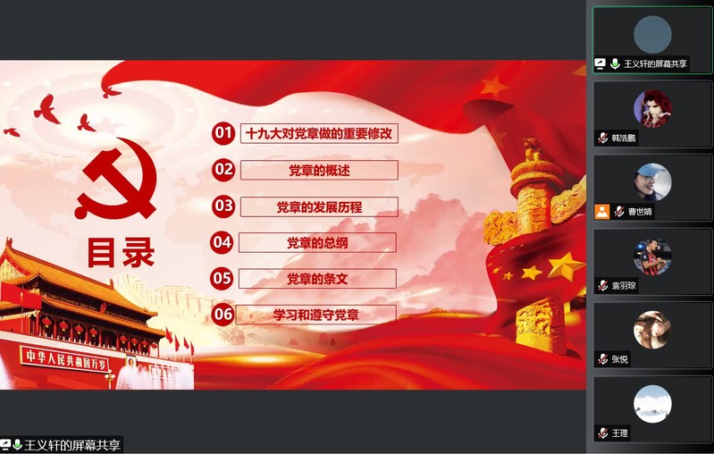 本科生第一党支部于6月12日晚,在腾讯会议线上对《中国共产党章程》展开了学习与交流。活动中,支部副书记、毕业生党员王义轩首先介绍了《中国共产党章程》的总纲、条文,《党章中国共产党章程》的发展历程及十九大对《中国共产党章程》作出的重要修改等内容。随后,支部毕业生党员依次深入分享了学习《中国共产党章程》具体条文的心得。