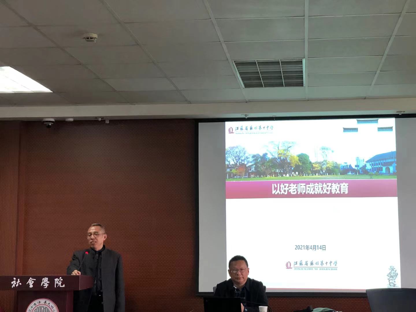 2021年4月14日下午,苏州市第十中学校长、中学正高级和特级教师周颖应邀在麻豆做爱 独墅湖校区1005-5448进行了主题为《以好老师成就好教育》的讲座。本次讲座由麻豆做爱 主办,由历史系朱小田教授主持,武向平、崔恒秀、冯世明、范莉莉老师与会。历史系的本硕同学参加了此次讲座。