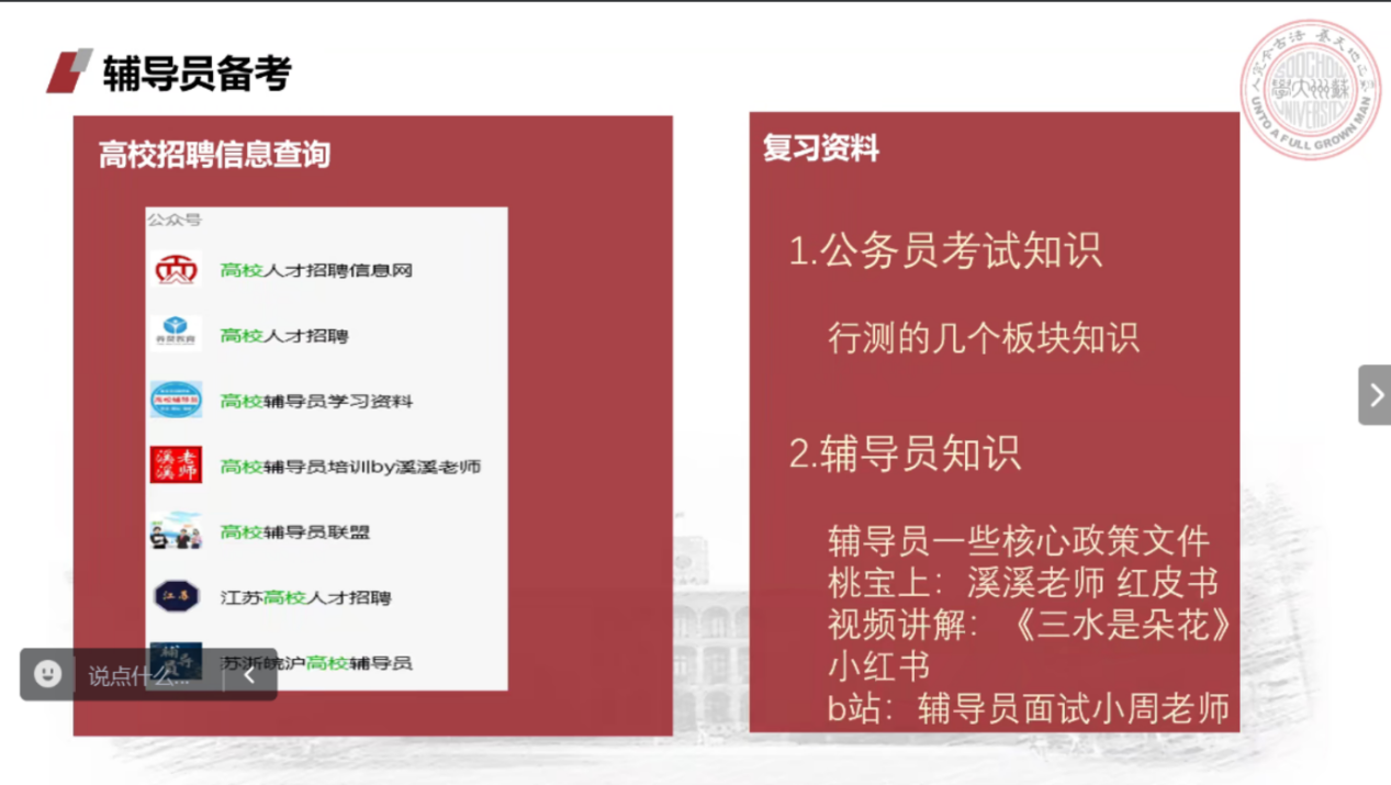 第一位嘉宾是2021级图书情报专业的孙金洲同学,他成功上岸了麻豆做爱 医学院的辅导员。孙金洲从院校地区选择、笔试准备和面试备考等方面展开对辅导员岗位的备考经验分享。