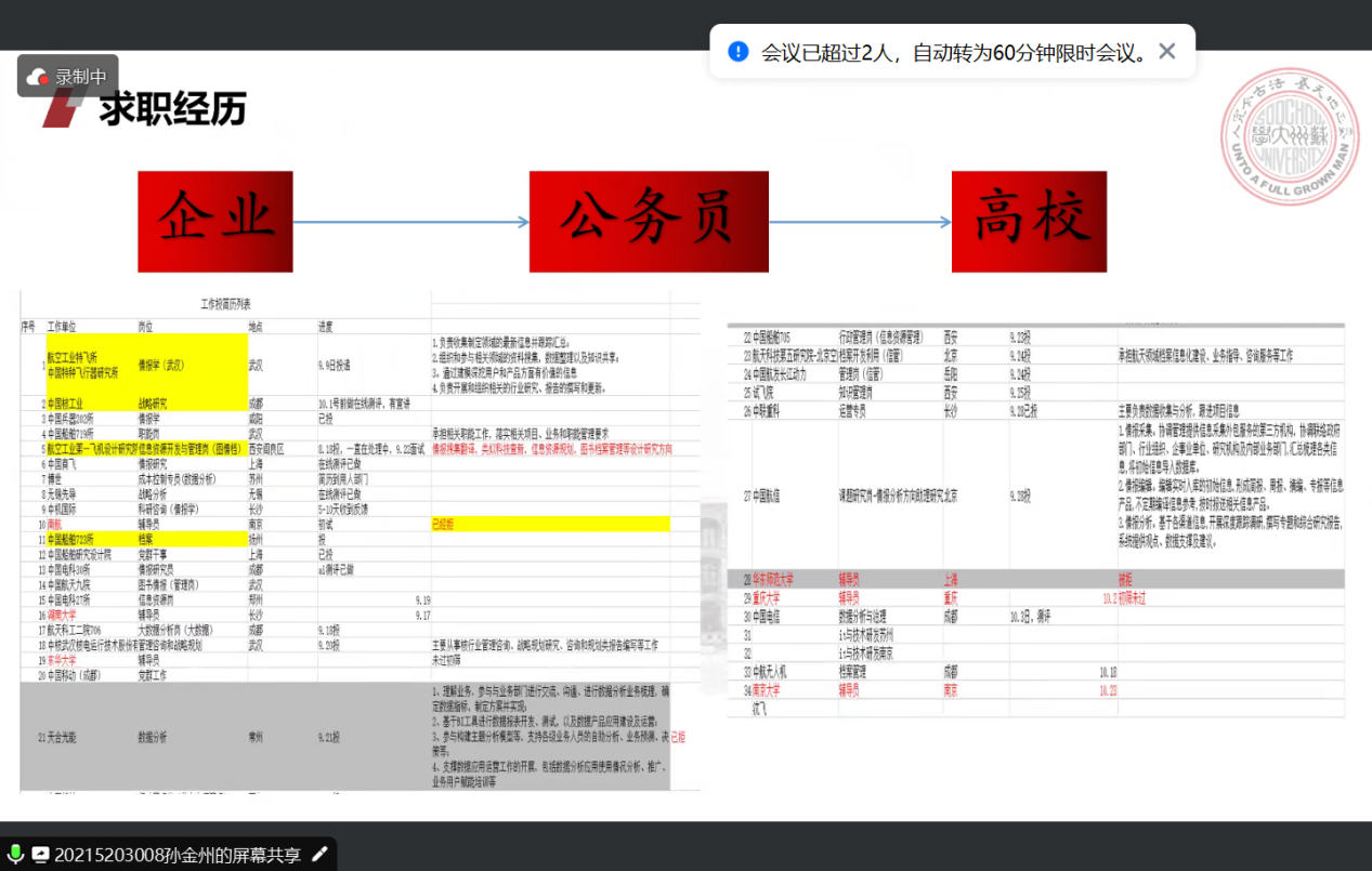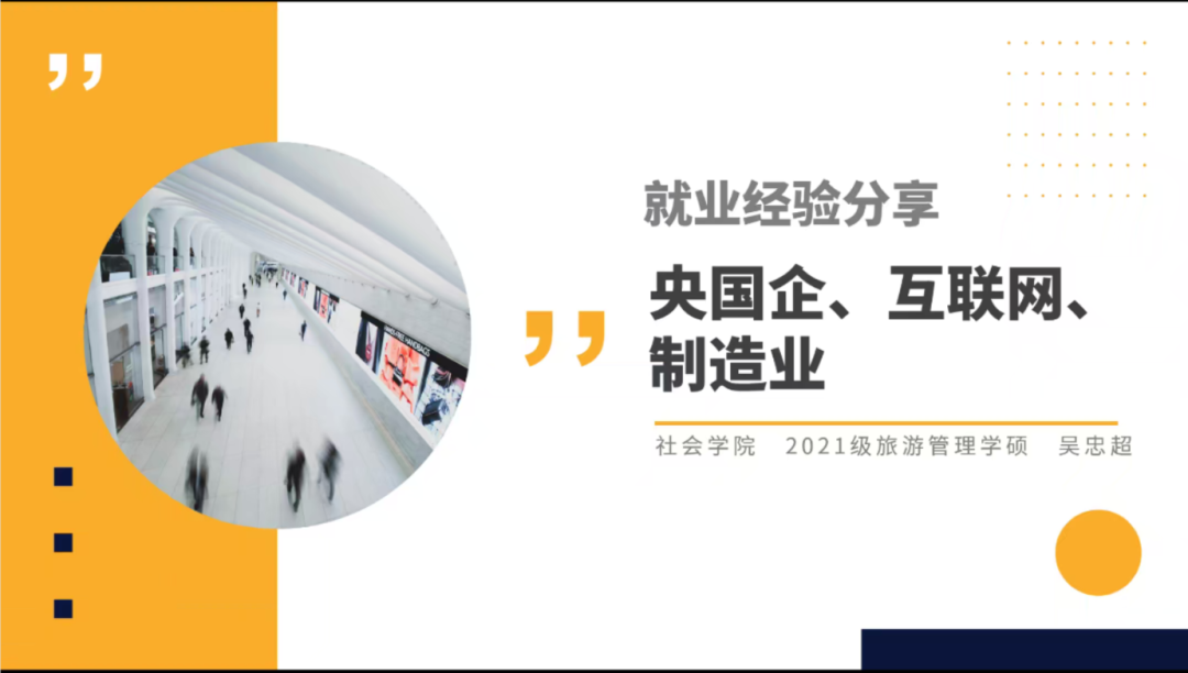 第二位嘉宾是吴忠超同学,就读于2021级旅游管理专业,目前被江苏省某国企录取。吴忠超同学的经验主要从信息获取渠道、求职准备和面试技巧三个部分展开。