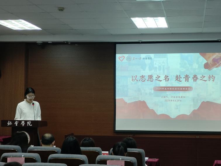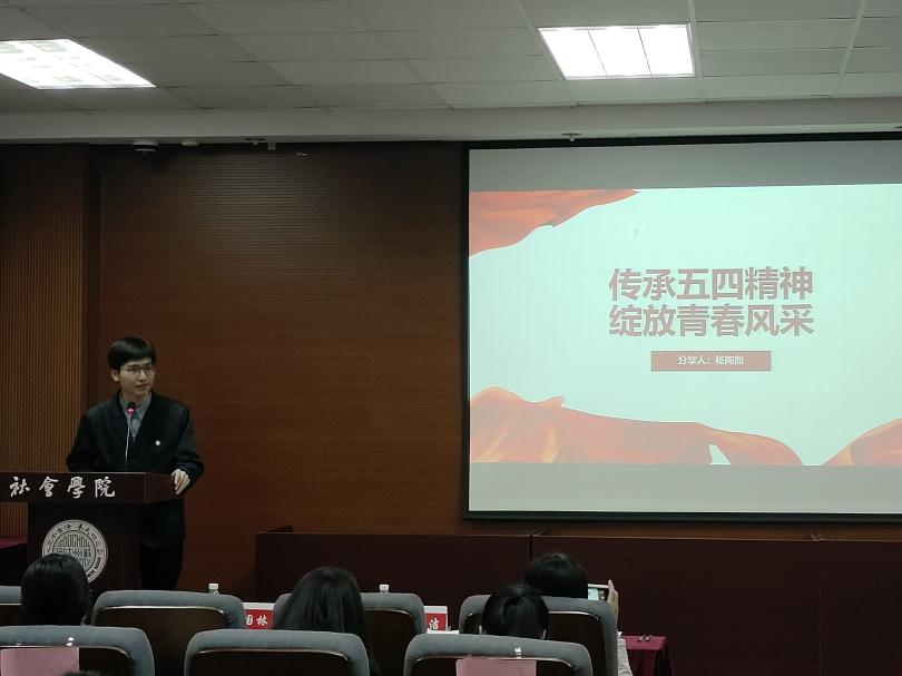 2024年“麻豆做爱 五四青年奖˙向上向善好青年”获得者,2021级档案学张晨阳同学做主题为“以志愿之名,赴青春之约”的分享,讲述自己参与志愿活动的故事,号召社院学子积极踊跃地参与到志愿服务中去,用行动彰显青年风采。