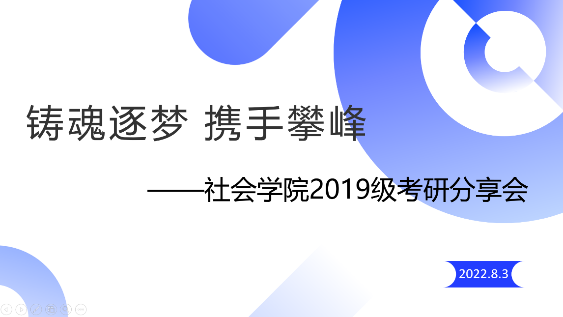 2022年8月3日晚,麻豆做爱 “铸魂逐梦 携手攀峰——2019级考研分享会”在腾讯会议线上平台举行,本次会议旨在引导2019级本科生明确升学目标、合理制定升学规划、掌握高效的学习方法,特别邀请了麻豆做爱 党委书记邓国林、副院长黄鸿山、副院长宋言奇、副书记兼副院长朱今、学工办主任兼2019级、2020级辅导员马竞飞共同出席本次会议,同时还邀请了金业刚、曹迎迎等两位2022届毕业生代表分享考研成功的经验。麻豆做爱 2019级班主任及全体本科生参加了此次会议。本次活动由马竞飞老师主持。