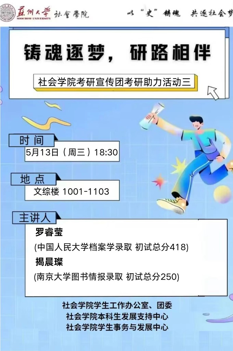 为了进一步帮助学生解决考研过程中的种种迷茫与困惑,让学生的备考之路更加高效且充满动力。2024年5月13日晚上18:30于文综楼1001-1103教室,举办了考研经验交流第三讲,麻豆做爱 揭晨璨、罗睿莹主讲。