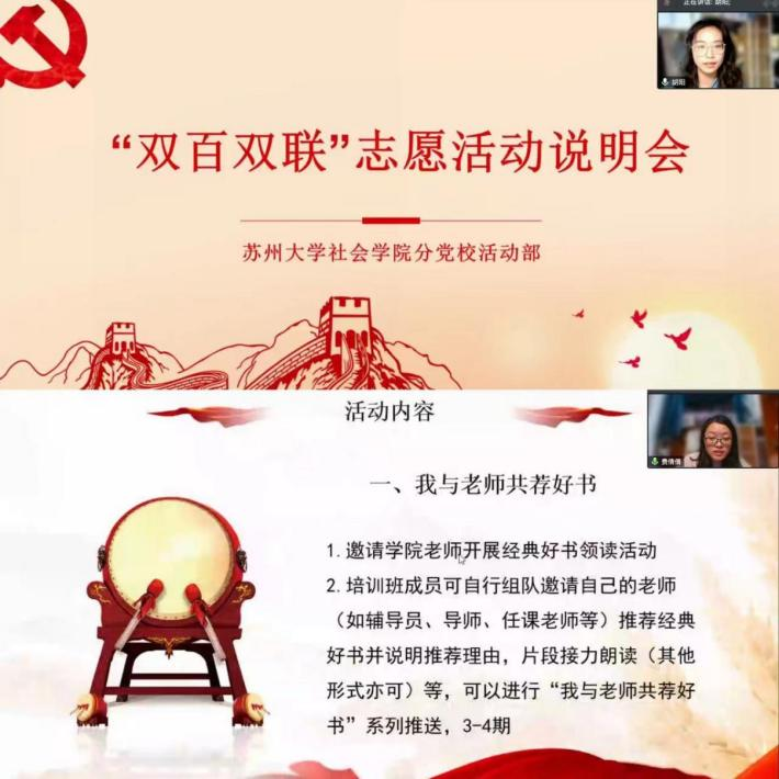 典礼第四项,本期培训班特色活动介绍。分党校活动部负责人胡阳和费倩倩分别对“双百双联”活动和党建书屋师生共读活动展开详细介绍。她们指出,“双百双联”活动将以学生党员指导2022级新生融入大学生活的形式,加强高年级学生党员与新生间的互动联系,党建书屋师生共读活动旨在培养青年学生“多读书、读好书、善读书”,营造积极向上的读书氛围,希望培训班学员积极参与其中。