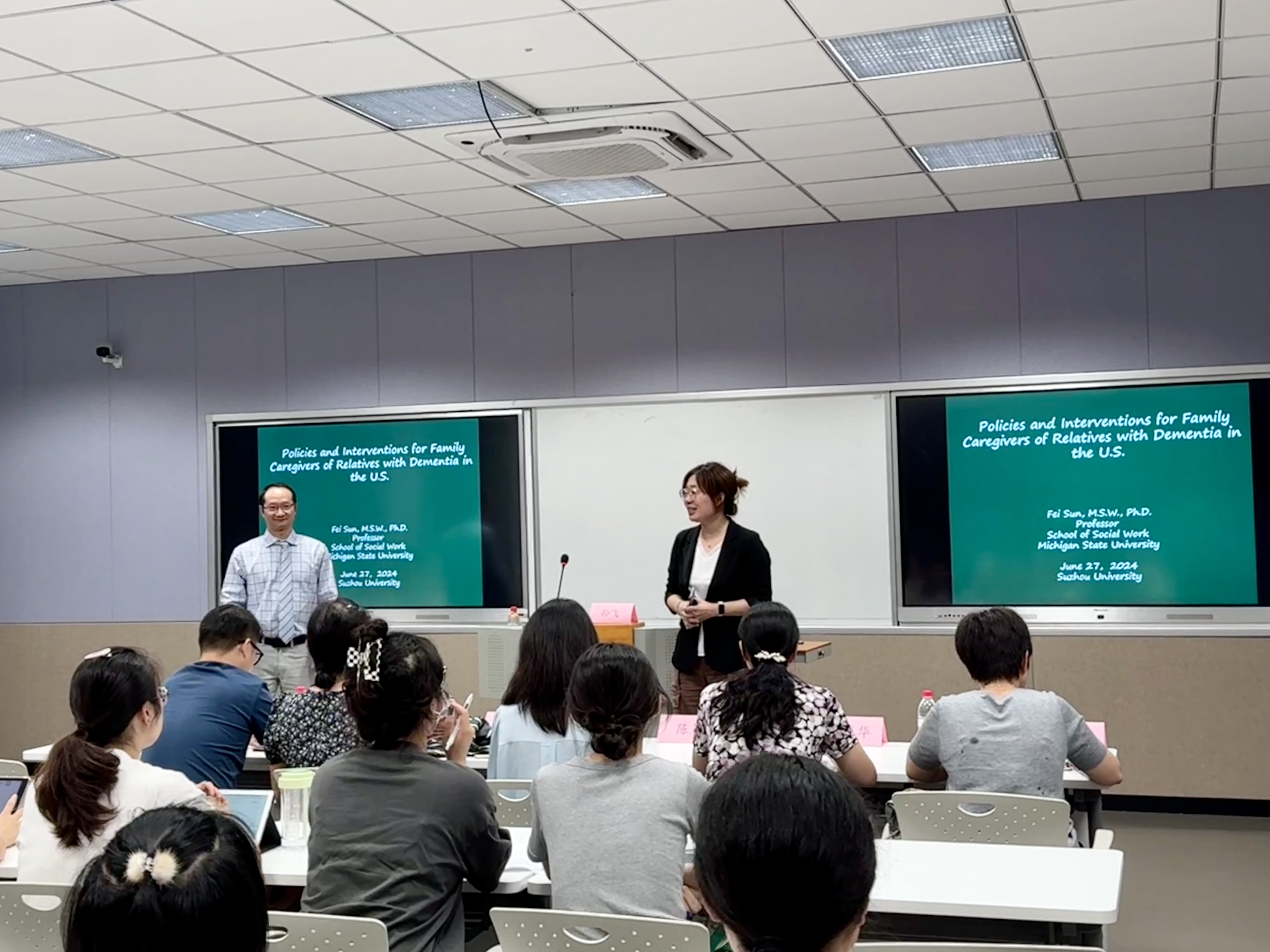 孙飞教授的讲座内容丰富,涵盖了认知症相关的理论知识与实务经验。以苏州和密歇根州的异同为切入点,引入了老年失智症的概念,深入讲解了失智症的学理知识,帮助大家树立对认知症的正确认识。讲座过程中,孙教授通过现场教学,让大家亲身感受老年人视觉、行动的变化。随后,孙飞教授结合个人研究及亲身体验,详细介绍了失智症患者及照顾者的多重需求与现实问题,让大家对美国认知症的家庭照料有了更深入的认识和理解。最后,孙飞教授从美国的经验出发,讲解了美国针对失智症患者出台的各种政策以及相关政策引导下的服务,并提出了自己的观点:社会依旧需要加强对失智症的认识,并提升相关服务的针对性和公平性。