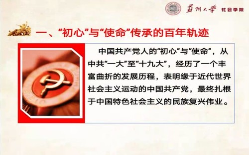 金教授先讲述了初心和使命百年来的传承轨迹。从中共一大到十九大,中国共产党的初心与使命经历了一个丰富而曲折的发展历程,最终扎根于中国特色社会主义的民族复兴伟业。习近平总书记在党的十九大报告中强调,中国共产党的初心与使命就是为中国人民谋幸福,为中华民族谋复兴。