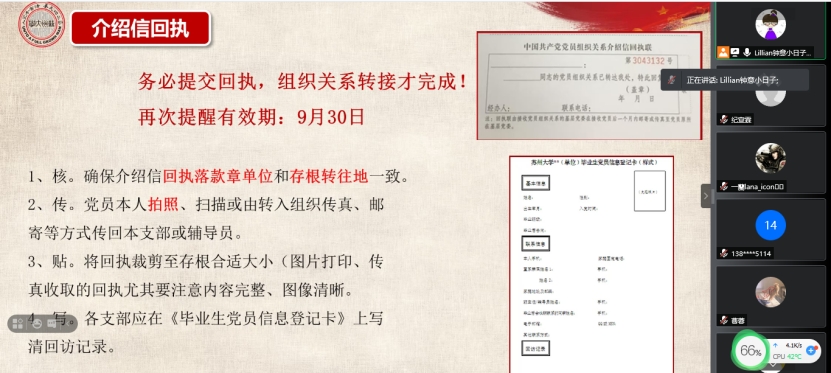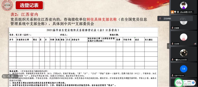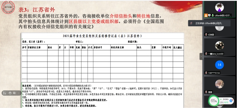 会议第二项议程,毕业生党员组织关系转出登记表解读。李玲老师结合毕业生党员的不同去向,主要分为校内、省内、省外三种情况,对于转出登记表中重要内容的填写进行了逐一说明,特别强调省内同学党组织关系转出地点一定要精确到各支部,省外同学需注意纸质版介绍信的规范填写。
